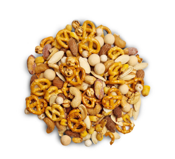 Peanuts, cashews, almonds, chickpeas crunchy (wheat flour, sugar, salt, corn starch), pretzels (wheat flour, 4,5% salt, rapeseed/palm oil, wheat malt, yeast, raising agent (E500), acidity regulator (E524). May contain traces of sesame and other nuts, corn, (vegetable fat (palm), flavour enhancer: E621, sugar), pumpkin seeds, yellow chickpeas, white chickpeas (95%), salt (4.5%), thickener E500, rapeseed oil, sea salt